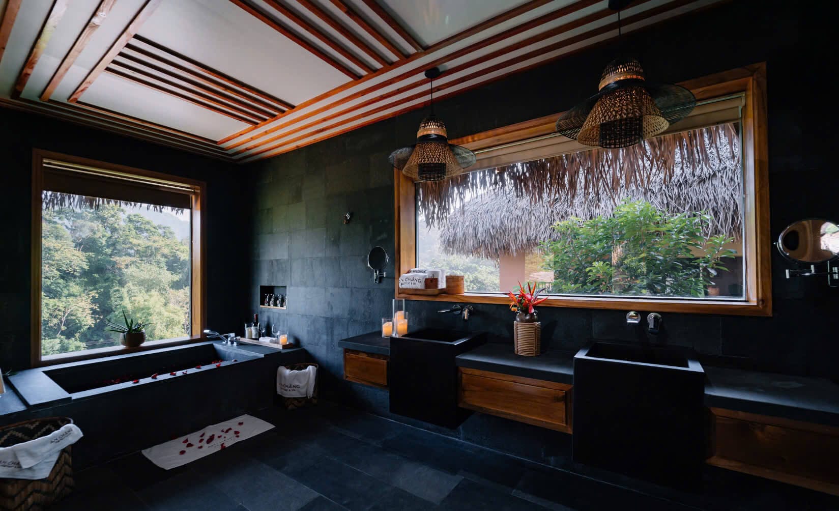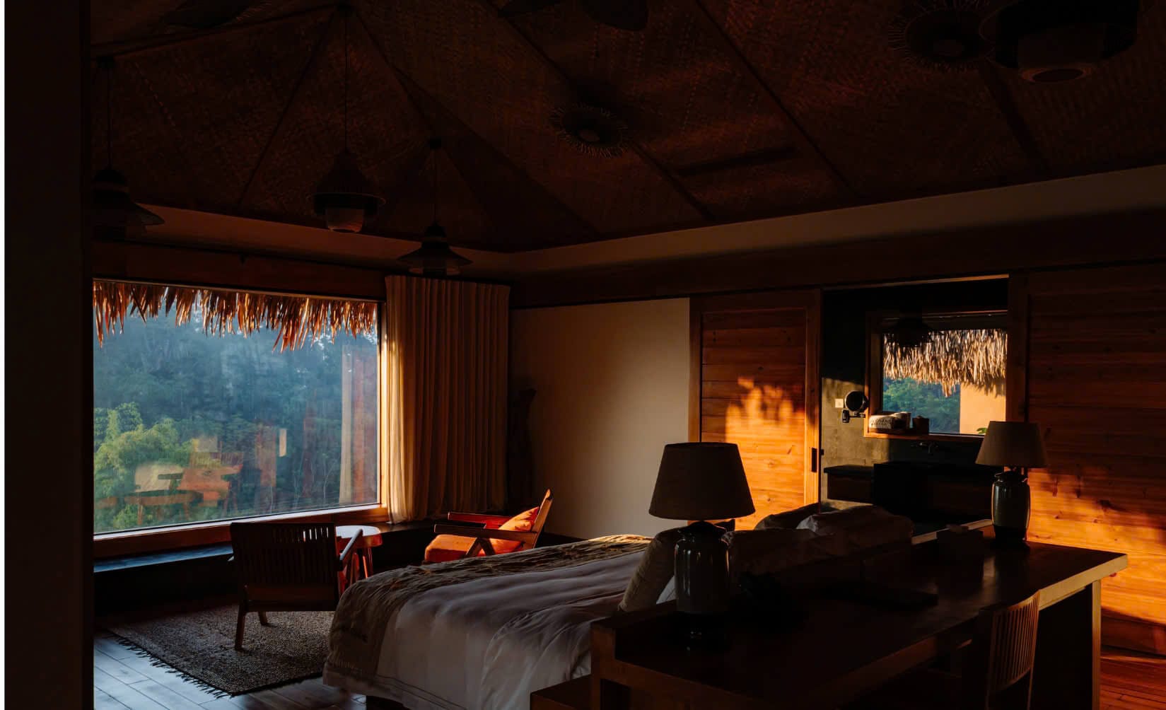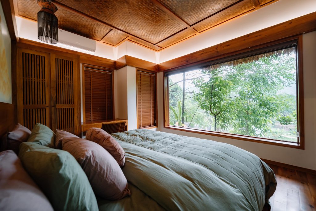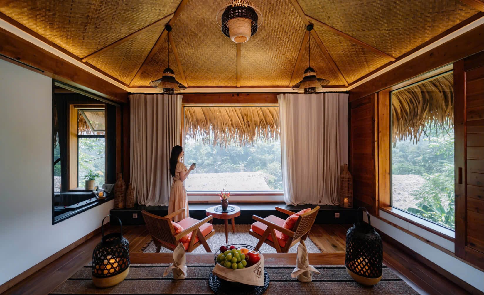 Điểm nhấn đặc biệt là ban công thoáng đãng với tầm nhìn ôm trọn thiên nhiên – nơi sớm mai ánh nắng len qua tán lá, hay chiều về tiếng chim rừng ríu rít. Kiến trúc mộc mạc từ gỗ, tre và đá hòa quyện cùng sự tiện nghi tinh tế, tạo nên một không gian vừa thân thuộc, vừa sang trọng.