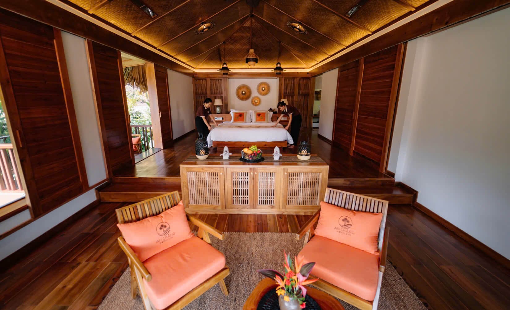 Perched at the highest point of the retreat, the Orchid Majesticview Suite offers an expansive 80m² of living space, designed in perfect harmony with nature to create an ideal sanctuary for relaxation. Its charming balcony opens up to breathtaking views of traditional palm-roofed houses and lush green hills, instilling a profound sense of peace. The interior furnishings and decor have been meticulously curated, blending seamlessly with the overall design to evoke an atmosphere of pure elegance and comfort.